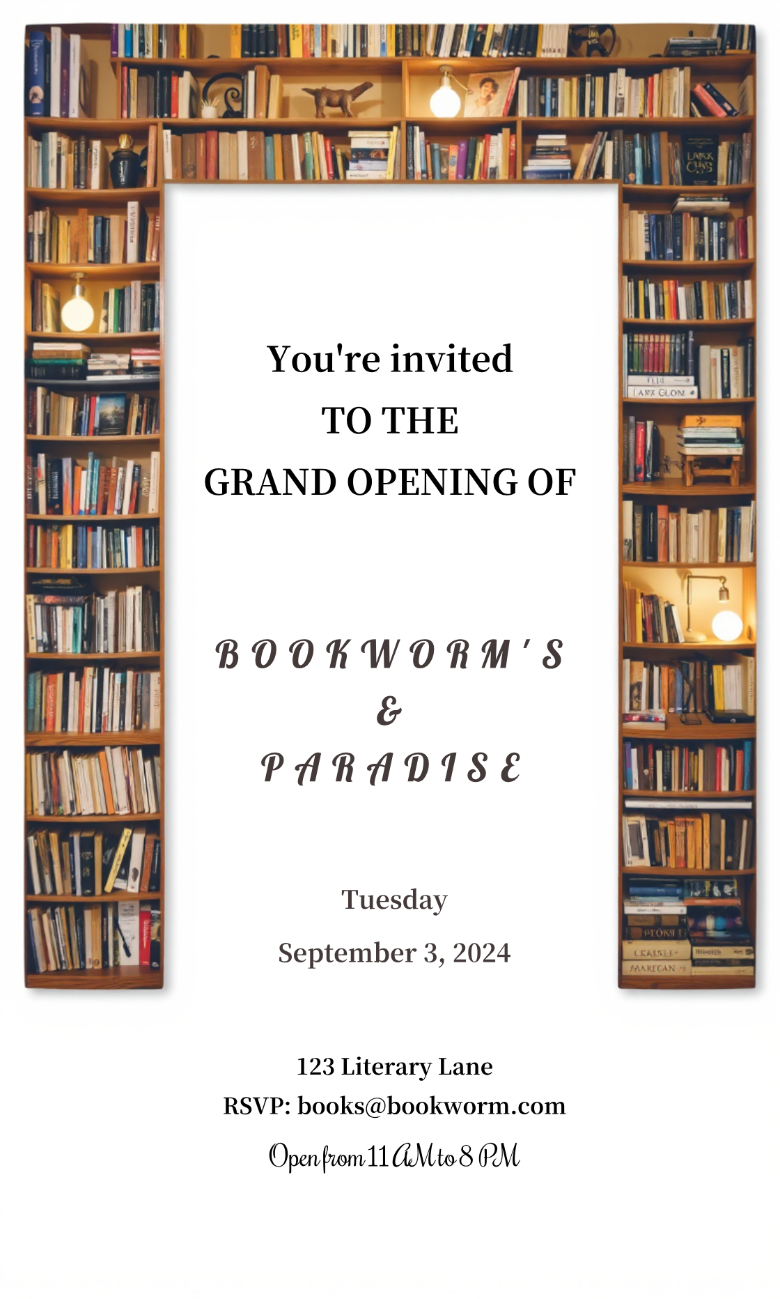 Craft an invitation for 'Bookworm's Paradise' bookstore opening on September 3, 2024, at 123 Literary Lane, 11 AM-8 PM. RSVP to books@bookworm.com. Use warm brown and cream colors.