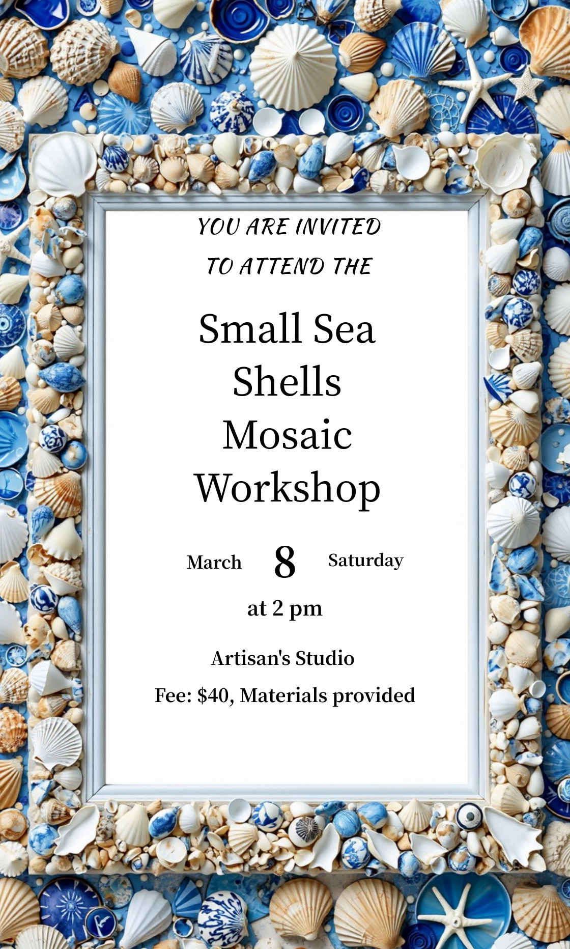 Personalize this Small Sea Shells Craft Ideas DIY Mosaic Workshop Invitation template!